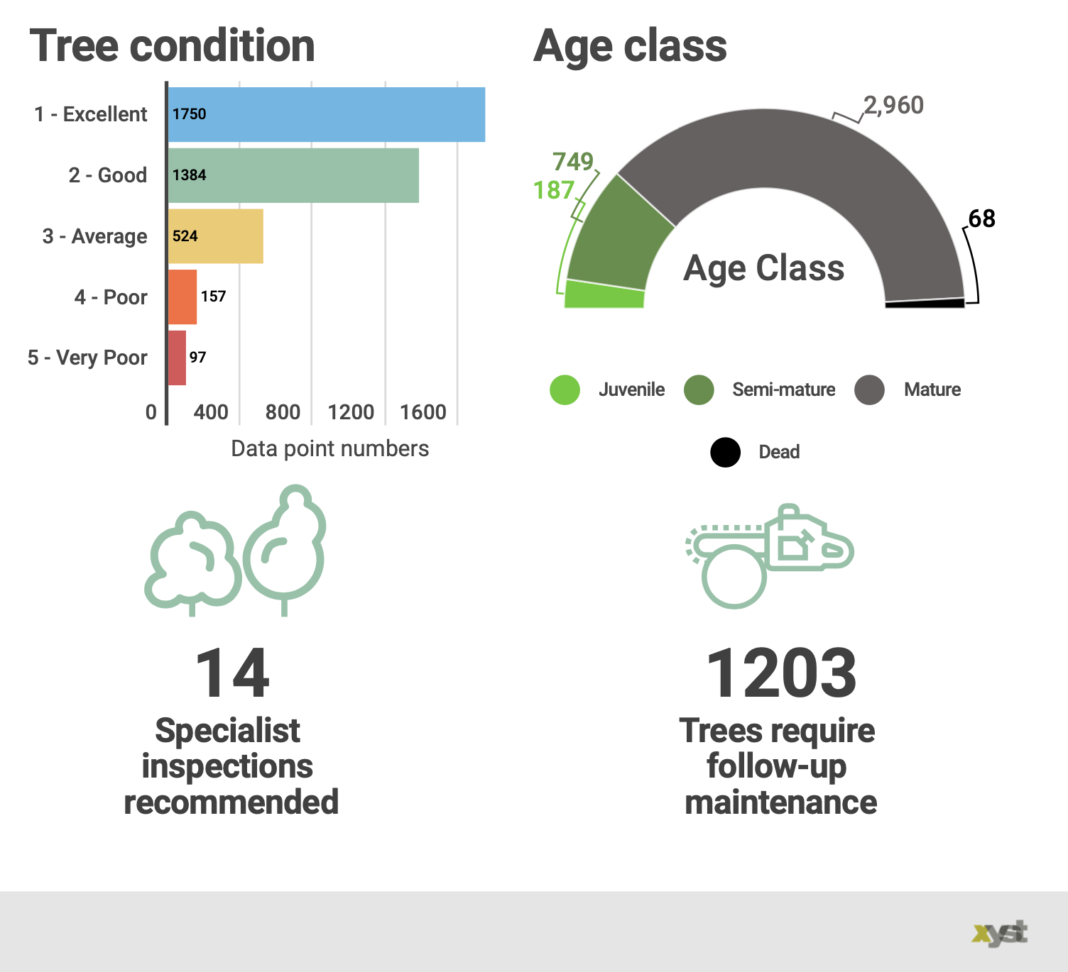A team of two travelled the district during 2020 and 2021 using a mobile app to GPS the locations of street and park trees, complete a condition assessment and identify maintenance work required. Hazards were notified immediately to the client where urgent action was required to mitigate risk. A total of 5,555 data points were collected representing around 13,000 trees.